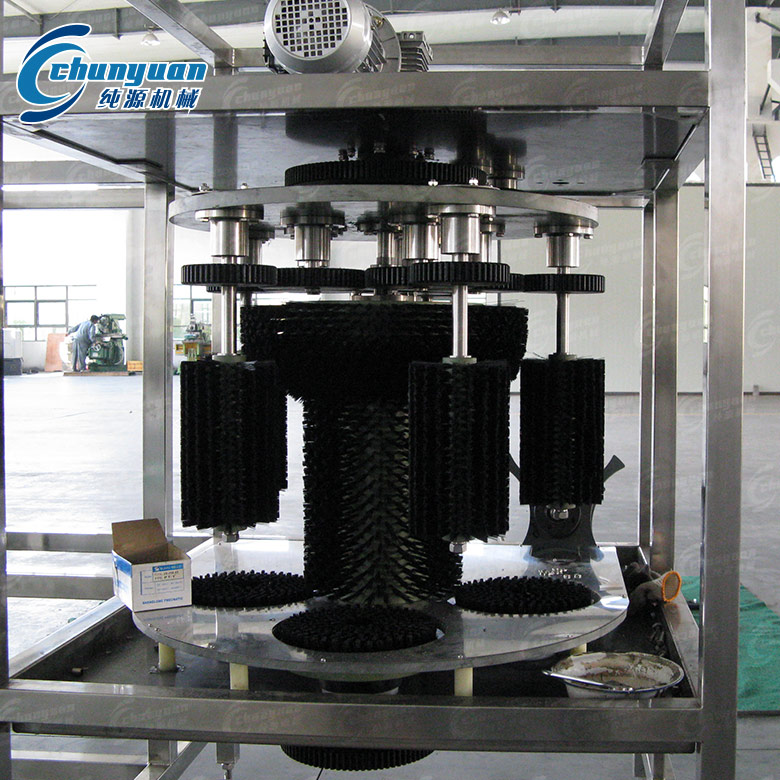 全自動外刷桶機由不銹鋼機架、封板(不銹鋼〉、主旋轉毛刷、毛刷調速電機、撥輪調速電機、捅底部旋轉毛刷、撥輪結構、 沖洗水泵、噴淋室等組成。全自動外刷桶機采用優(yōu)質不銹鋼制作,耐腐蝕,易清洗。主要氣路原件均采用臺灣亞德克產(chǎn)品,該機結構緊湊, 工作效率高且穩(wěn)定可靠,自動化程度高,操作簡單。