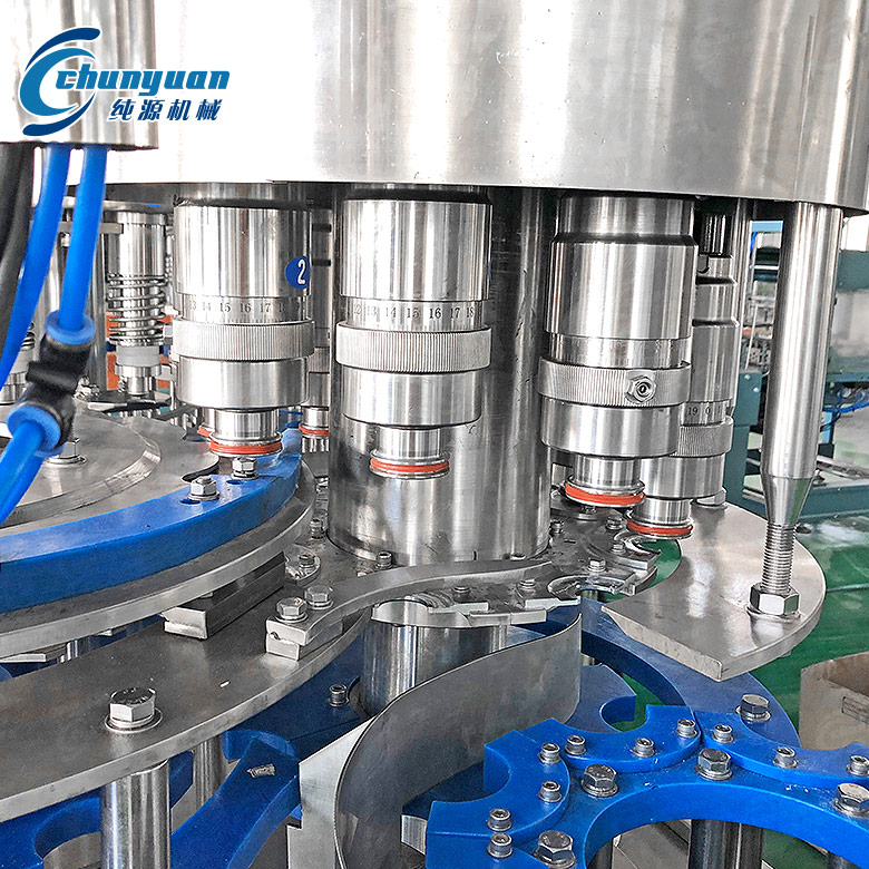 小瓶裝三合一純凈水設(shè)備。進(jìn)入灌裝機(jī)的瓶子由瓶頸托板卡住并在凸輪作用下將瓶子上升,然后由瓶口將灌裝閥頂開(kāi)。灌裝采用重力灌裝方式。灌裝閥打開(kāi)后物料通過(guò)灌裝閥完成灌裝過(guò)程,灌裝結(jié)束后瓶口下降離開(kāi)灌裝閥,瓶子通過(guò)卡瓶頸過(guò)渡撥輪進(jìn)入旋蓋機(jī)。